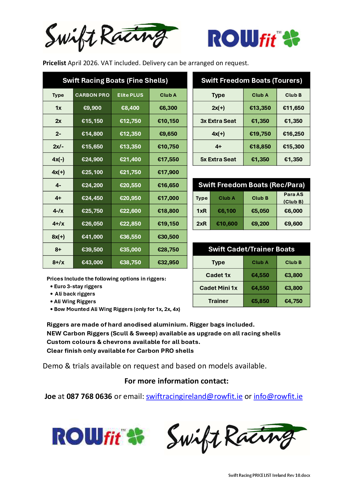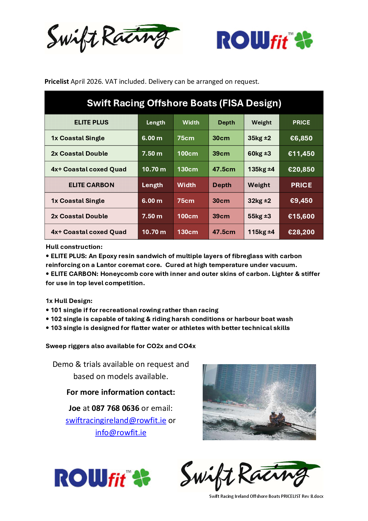 For additional online information and technical specs you can check out the Swift Racing, email Joe at info@rowfit.ie or call +353 (0)87 768 0636 or 087 338 3267